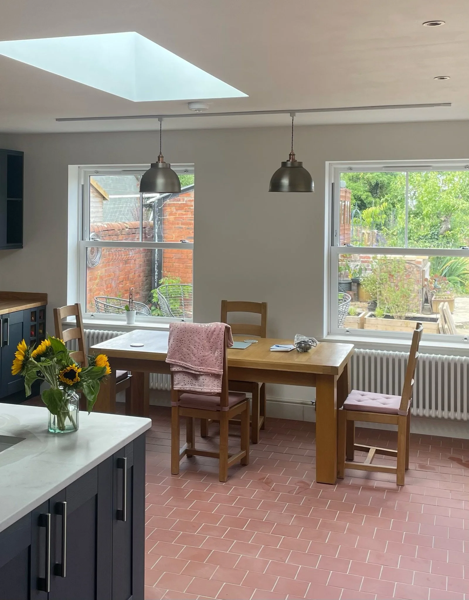 Our customer approached us with a set of drawings and a 3D model of a large flat roofed extension with sky lights. This project involved the demolition of an existing outhouse style building, groundworks, the erection of a new extension with flat roof, skylight installation, all internal work and a kitchen installation.